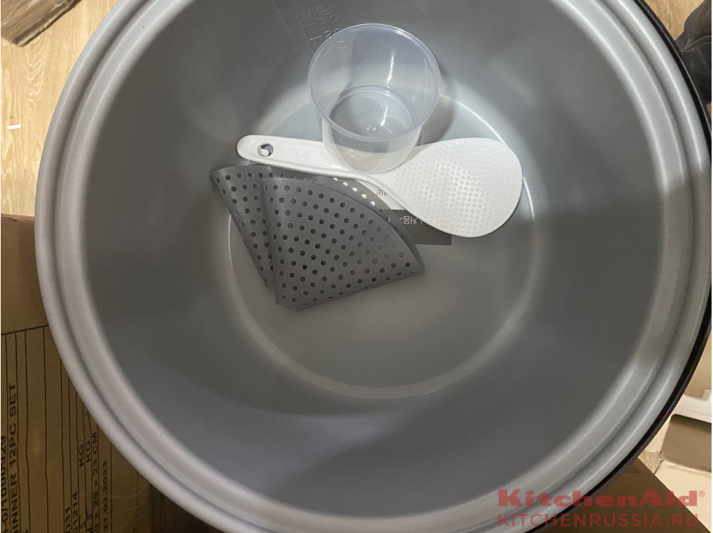 В комплекте к рисоварке входит: мерный стакан, ложка и силиконовая пластина.